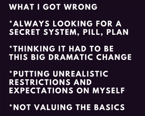 When you’re starting out don’t try to do everything all at once. That’s what set me back every time because I had impossibly unrealistic expectations and if I slipped up once I would immediately go back to my unhealthy habits. The first 3-4 months I just laser focused on my diet and hydrating. Then I noticed I was sleeping better, so I started incorporating good rest and recovery. I didn’t start working out consistently (I think I did 1 workout in the first 90 days, classic gung ho Krista style, which was really dumb and almost set me back entirely) until after 6 months.