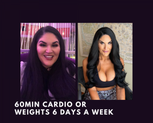 60 Minutes of Cardio or Weight Lifting 6 days a week. Initially I did every day and it was just way too much. Then I tried super heavy weights, which I loved, but which ended up causing me more pain than it was worth. Ultimately I really enjoy my neighborhood walks and light weight lifting (or even better: my own body weight resistance with bands or old school exercises like squats, push ups, etc).